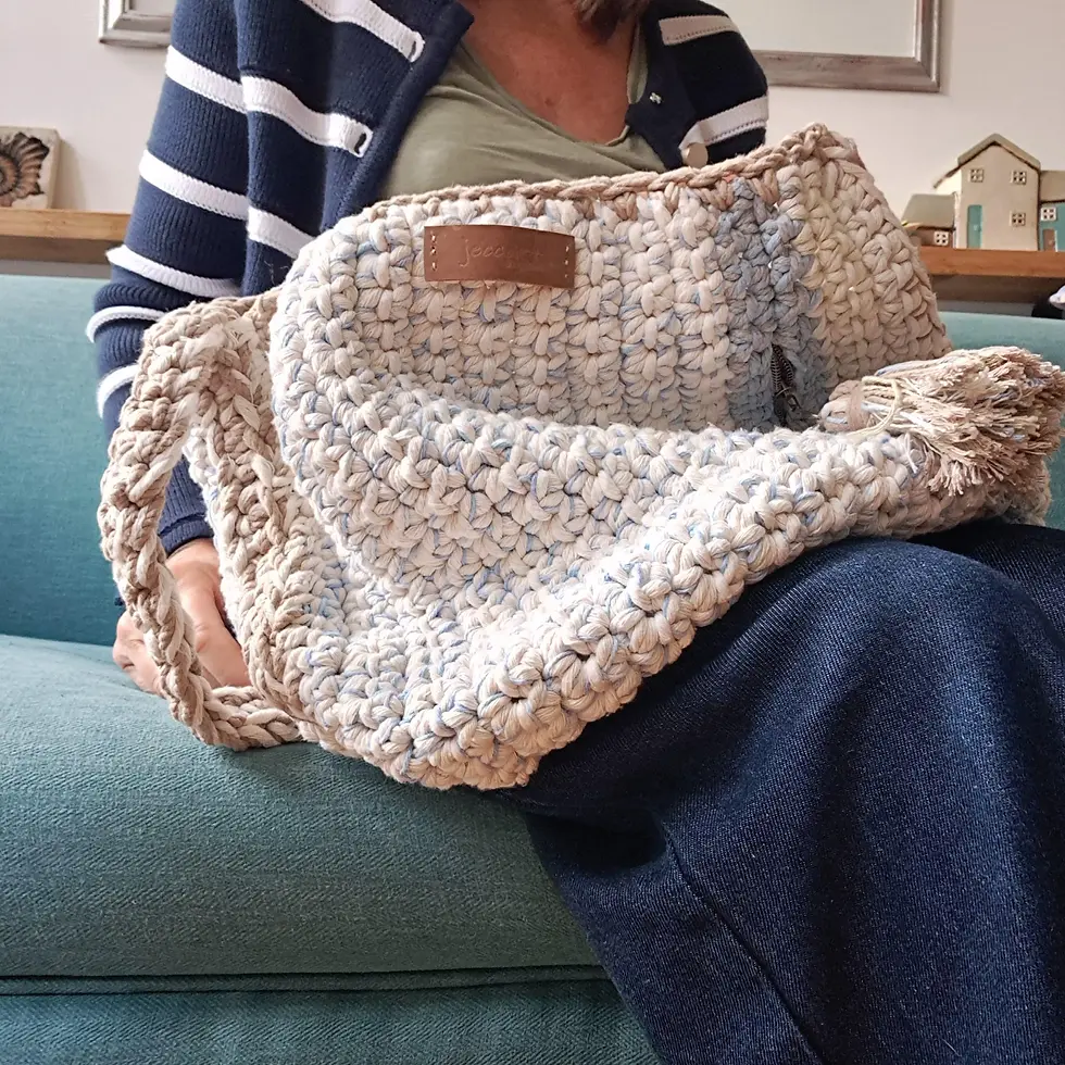 'Northumberland' - Large textured blue and white raffia and wool beach style bag